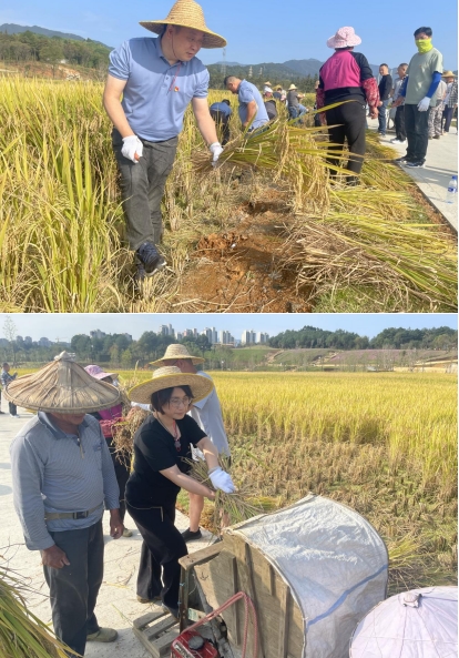 秋意漸寒,稻谷飄香為深入貫徹習近平總書記關于實施鄉村振興戰略和糧食安全的重要論述,以學促干,推動學習貫徹習近平新時代中國特色社會主義思想主題教育見行見效2023年117上午,市政集團黨支部組織全體黨員干部龍州濕地項目開展“傳承蘇區好作風 四下基層促發展”主題黨日活動,全面助力稻谷收割工作