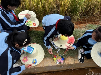 體驗的快樂和汗水激發了孩子們的興趣,水稻田旁,孩子們用豐富的色彩,在草帽上留下了自己的奇思妙想,孩子們相互交流,處處歡聲笑語,吸引了路過的游客駐足觀賞。