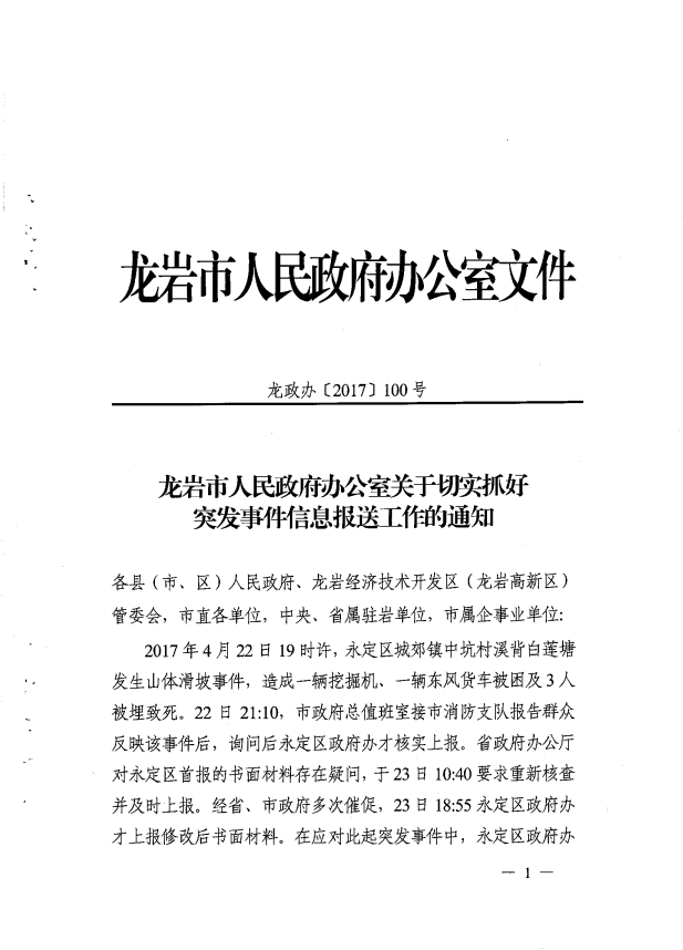 市政府辦關于切實抓好突發事件信息報送工作的通知(龍政辦【2017】100號)