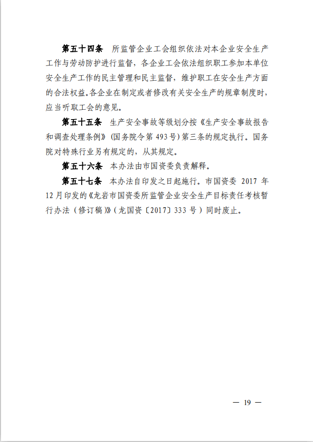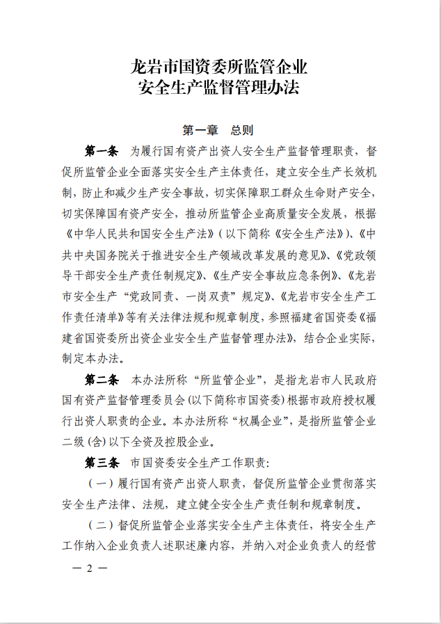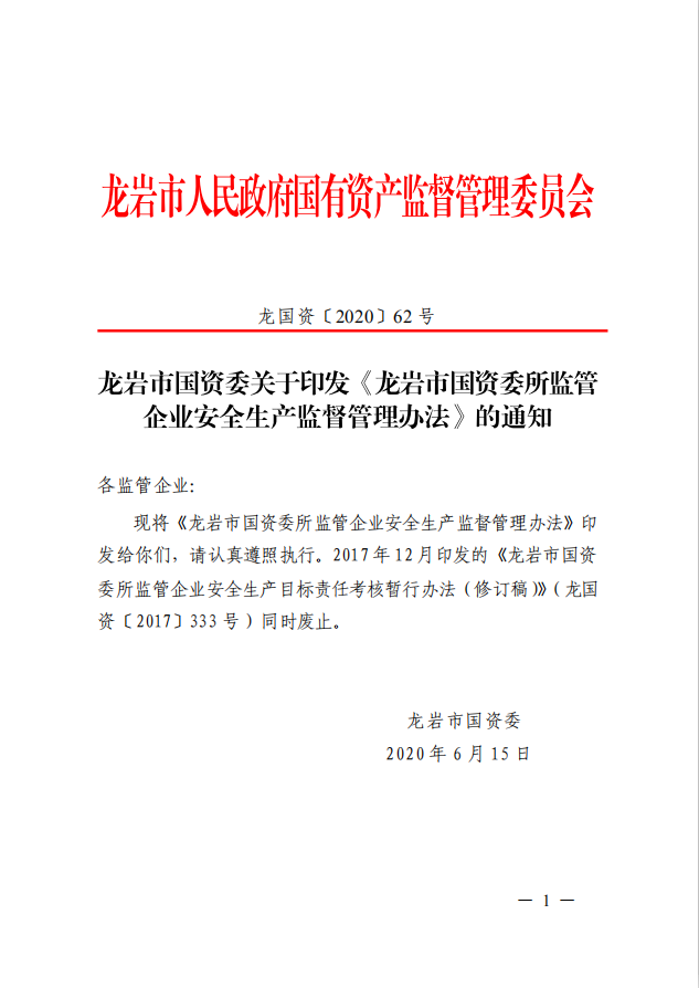 龍巖市國資委關于印發《龍巖市國資委所監管企業安全生產監督管理辦法》的通知(龍國資[2020]62號)